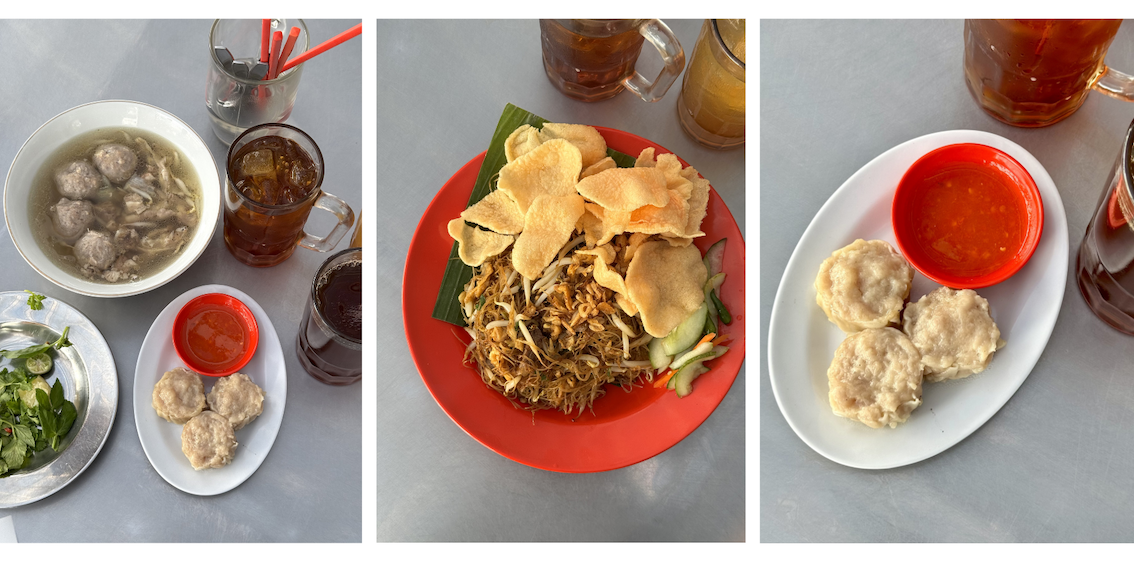 Pesanan kami bertiga adalah bakso urat polos sebanyak empat buah (36K) ditambah ceker (7.5K) dan tetelan (7.5K). Lalu sepiring bihun goreng sengkel telor bebek (34K), mie goreng (25K), tiga siomay original (20.4K), lumpia vietnam (23K), cireng saos kacang (20K), dengan minuman teh lemon dingin (18K), teh tawar dingin (7.5K), dan teh tawar panas (7.5K) yang free flow.