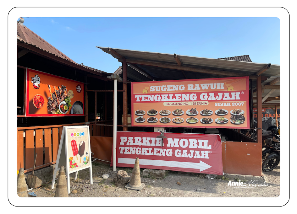 Spanduk besar berwarna bertuliskan “Sugeng Rawuh, Tengkleng Gajah, Tengkleng No. 1 di Dunia sejak 2007” terlihat dan terbaca dengan nuansa yang sangat provokatif. Di bawah sederetan tulisan ini, berbagai menu pun ditampilkan sebagai pelengkap informasi. Wah dari sini saja pikiran saya sudah langsung terjebak pada situasi istimewa yang akan saya segera hadapi. Turun dari mobil pun seolah menjadi langkah yang menentukan sekaligus tantangan apakah slogan yang tertulis tersebut adalah betul adanya.