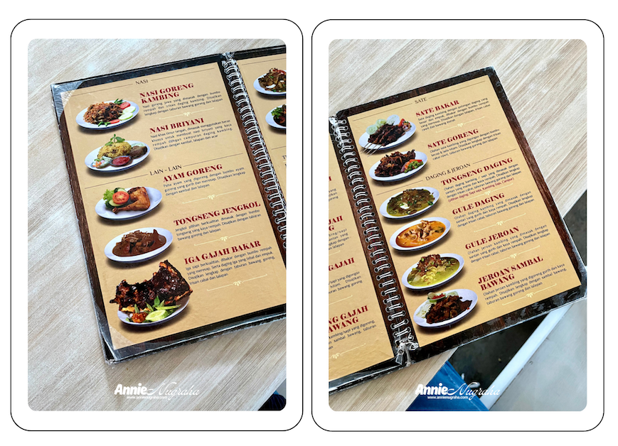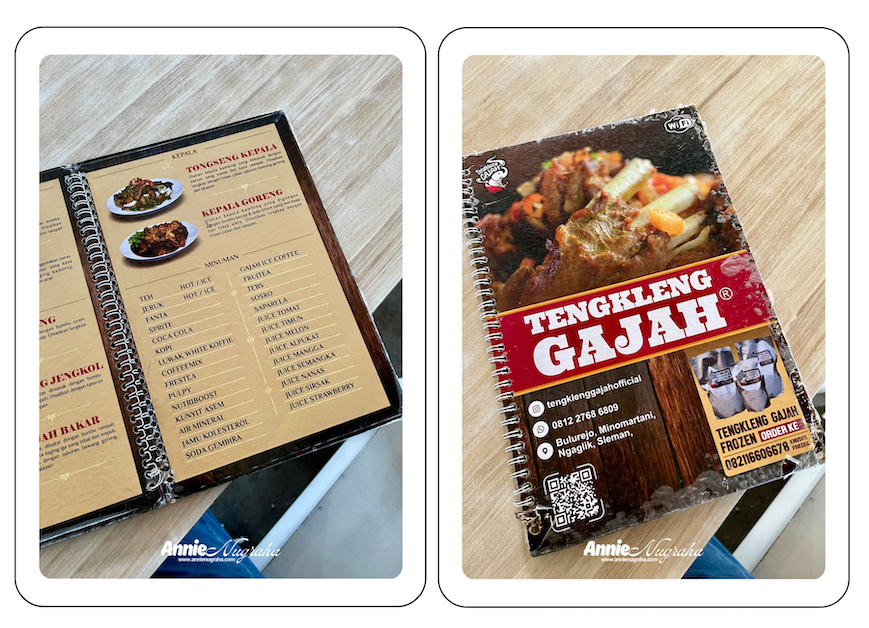 Kami berdua tampak kewalahan untuk menentukan apa yang ingin kami nikmati. Semua begitu menyelerakan. Yang pasti, dari buku menu yang saya pegang saat itu, apa yang ditawarkan oleh Warung Tengkleng Gajah dibuat sangat informatif. Setiap pilihan, selain diberikan nama secara spesifik, juga dijelaskan cara memasak dan bumbu yang dicemplungkan. Sementara harganya bisa kita lihat di kertas panjang pemesanan tadi. Foto-fotonya juga lumayan menarik. Cukup estetik dan bisa mewakili netra kita untuk menentukan apa yang akan kita konsumsi.