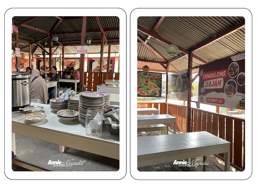 Spanduk besar yang menghadirkan jenama Tengkleng Gajah sudah terlihat dari kejauhan. Gak ada keraguan bahwa kita – calon pembeli – sudah tiba di tempat yang tepat. Posisi warungnya sendiri sedikit lebih rendah dari jalan raya yang berada di depannya. Tampak fasad dan bangunan warung pun biasa saja. Dindingnya sendiri – saat saya berkunjung – didominasi oleh kayu dengan atap yang juga sama sederhananya. Seperti bukan bangunan permanen tapi tetap terlihat kokoh.