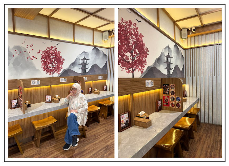 Di sisi belakang, ada toilet dan sebuah mushala kecil serta taman kecil dengan penerangan yang cukup. Setiap dinding tidak dibiarkan kosong. Ada mural dengan gambar pegunungan di Jepang. Rangkaian gambaran indah, hadir dengan warna yang soft betul. Lalu ada juga silhouette dua orang samurai yang sedang berlaga. Kemudian ada lampion merah dengan hiasan huruf Hiragana, Katakana, dan Kanji. Suasana negara matahari terbit yang matang betul. Salut buat interior designer nya. Gak mudah loh menata ruang dengan luas terbatas tapi tetap terasa lega.