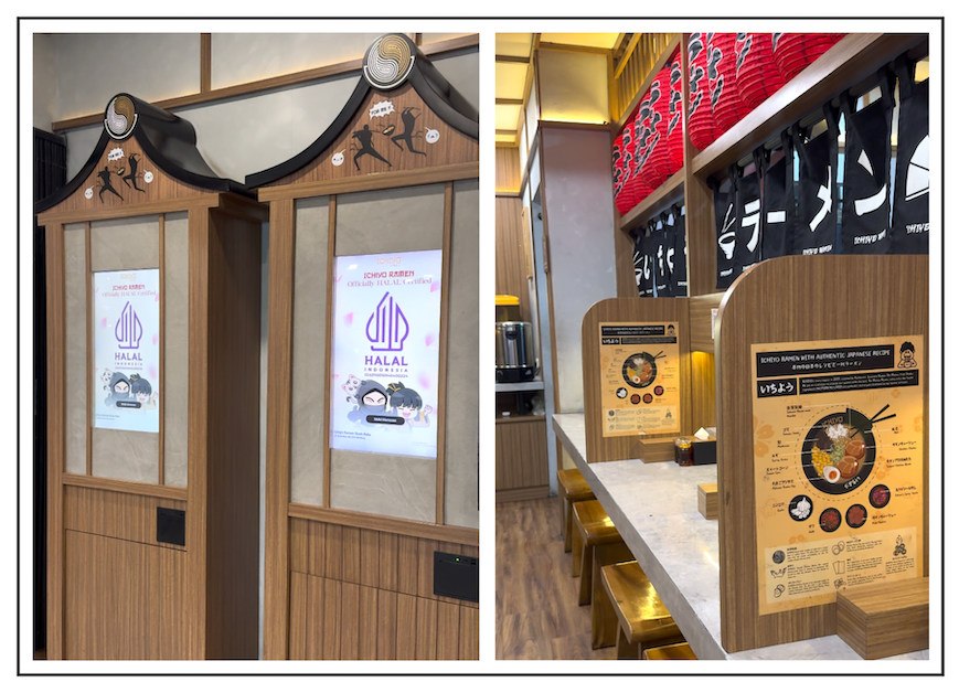 Dari sekian banyak dekorasi, saya menyempatkan diri membaca flyer yang ditempelkan di dinding pembatas area makan terbatas yang menghadap ke arah dapur. Di dalam stiker ini terurai beberapa info tentang Ramen Authentic Japanese Recipe. Di mana dalam semangkuk ramen dengan resep otentik Jepang wajib menghadirkan noodles berkualitas sebagai main ingredients, juga harus ada sesame seeds, mushroom, spring onion, sweet corn, garlic, chili, nori, chicken charsiu, special chicken broth, ichiyo’s spicy sauce, ajitsuke ramen egg, dan menma.