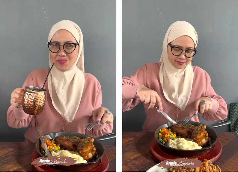 Saya dengan wajah bahagia menikmati sepiring besar Beef Back Ribs sajian dari Karnivor Kota Baru Parahyangan (Foto: koleksi pribadi)