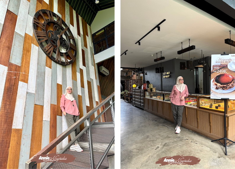 Dekorasi jam kayu besar yang ada di dinding tangga menuju ke lantai 2 (kiri) | Area display sederetan kue-kue yang berjejer manis di dalam kaca (kanan) (Foto: koleksi pribadi)