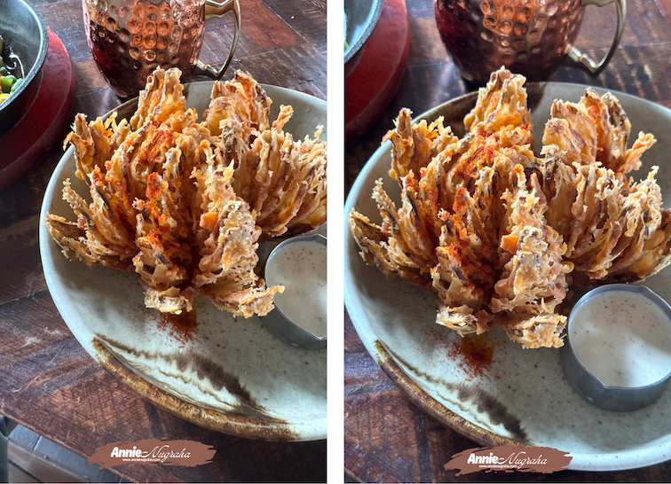 Tapi yang membuat saya terpaku di saat membuka lembar demi lembar buku menu adalah Blooming Onion. Sajian bawang bombay goreng dengan tampilan yang tidak biasa. Sebuah bawang bombay ukuran besar dipotong-potong dan dibentuk seperti layaknya bunga yang sedang merekah. Potongan ini kemudian digoreng terendam (deep fry) dengan lapisan tipis terigu yang menimbulkan efek garing.