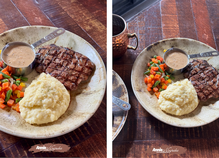 Selain Blooming Onion yang kami ber-3 habiskan secara keroyokan, suami memesan Tenderloin Steak dan si bungsu sama-sama memesan Sirloin Steak dengan side dish yang berbeda. Jika suami menginginkan kentang goreng (french fries), si bungsu mengikuti saya memesan mashed potatoes.