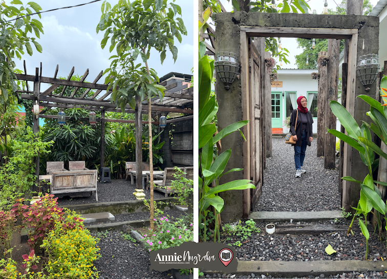 Sebuah taman sarat bunga ada di sisi kiri pintu masuk. Ada beberapa bangku kayu rustik yang diletakkan di sana. Cocok banget untuk menikmati sore saat langit cerah.