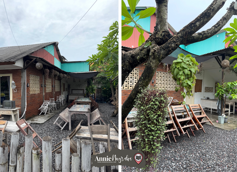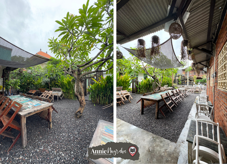 Di halamannya yang bertebaran dengan ribuan batu koral dihuni oleh banyak meja dan kursi kayu yang siap menampung puluhan tamu. Ada beberapa pohon yang tumbuh subur meski hanya di beberapa sudut dan beberapa gantungan lampu-lampu kecil diantaranya. Tempat yang tampaknya nyaman saat malam hari dengan langit cerah dan ribuan bintang hadir di angkasa.