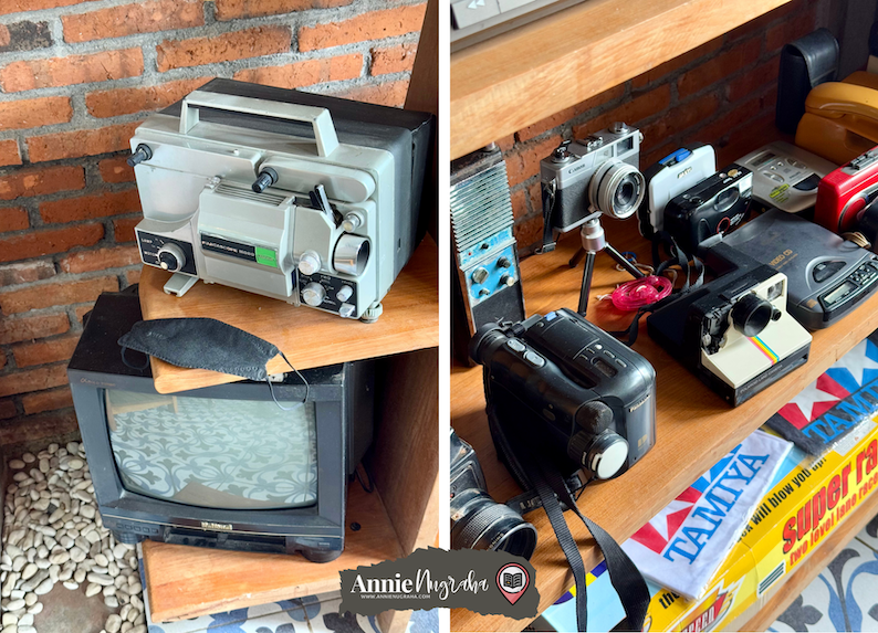 Saya melangkah mendekati pintu masuk yang tadi tidak bisa dilewati. Di salah satu rak dekat pintu ini ada sederetan mainan jadul seperti ular tangga, halma, kartu remi, dan lain-lain. Ada juga produk imitasi dari peralatan photography, radio, music player, televisi tabung, telepon analog dengan nomor putar, dan masih banyak lagi.